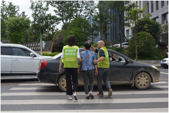 队员齐动手,对建勘大厦周围公共绿地的卫生环境以及卫生死角进行了清理。有人一手拿着垃圾袋,一手拿着竹夹子,有人拿着笤帚、簸箕等遍布在小区的各个角落,捡拾白色垃圾;马路上,遇到年老的长者和有孕的妇人,队员们也自发地走上前,搀扶长者及孕妇在来往的车辆中通过马路。
