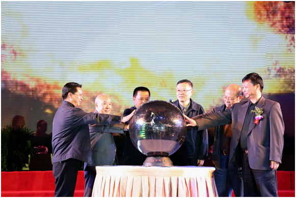 领导们启动象征着新生、团结、辉煌的圆形水晶球—标志贵州建勘企业集团成立