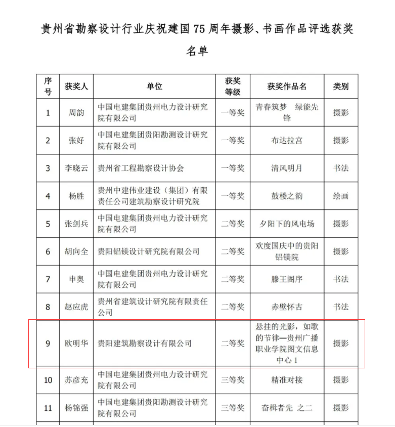 贵阳建筑勘察设计有限公司欧明华的摄影作品《悬挂的光影,如歌的节律一贵州广播职业学院图文信息中心》,在贵州省工程勘察设计协会举办贵州省勘察设计行业庆祝建国75周年摄影、书画作品评选和展览活动荣获二等奖。