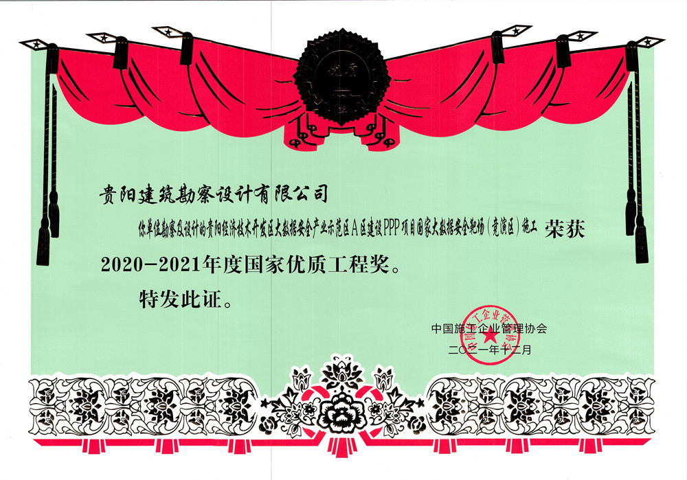 据悉,2020—2021年度国家优质工程奖评选结果已揭晓,依据《国家优质工程奖评选办法》,中国施工企业管理协会决定授予贵阳建筑勘察设计有限公司“贵阳经济技术开发区大数据安全产业示范区A区建设PPP项目国家大数据安全靶场(竞演区)”施工2020-2021年度国家优质工程奖。